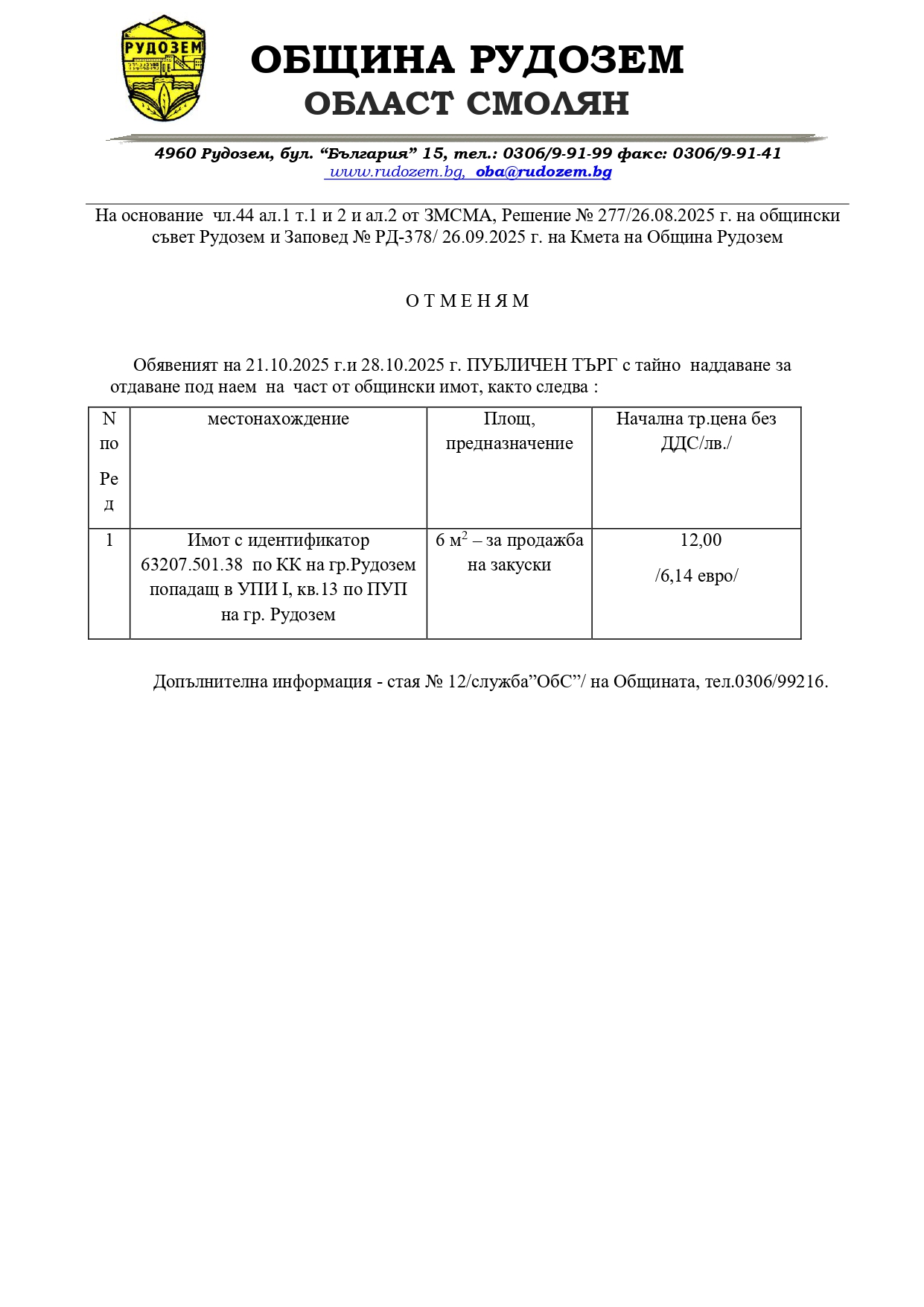 Отмяна на публичен търг за отдаване под наем – Община Рудозем