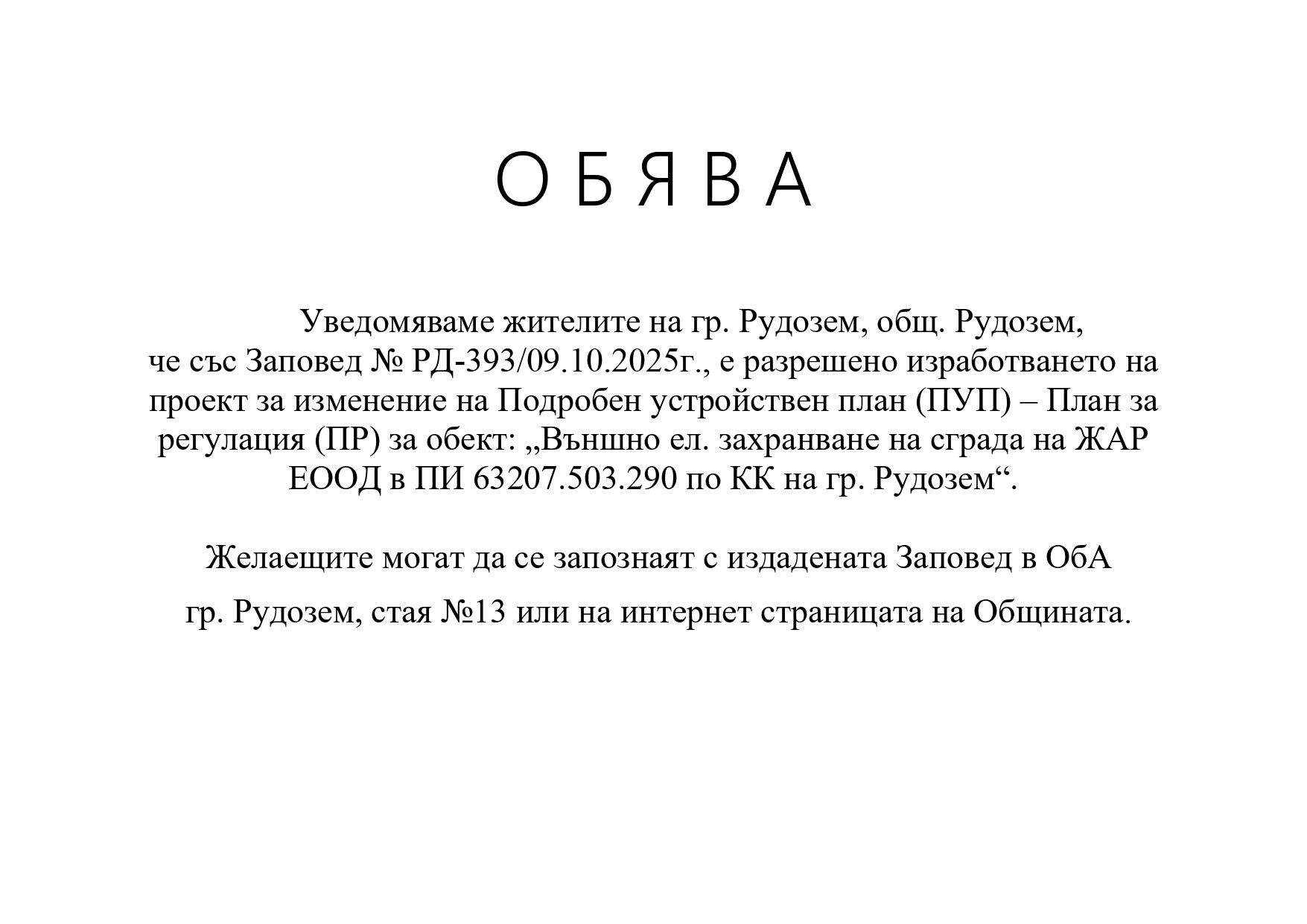 Обява и Заповед № РД-393 от 09.10.2025г.
