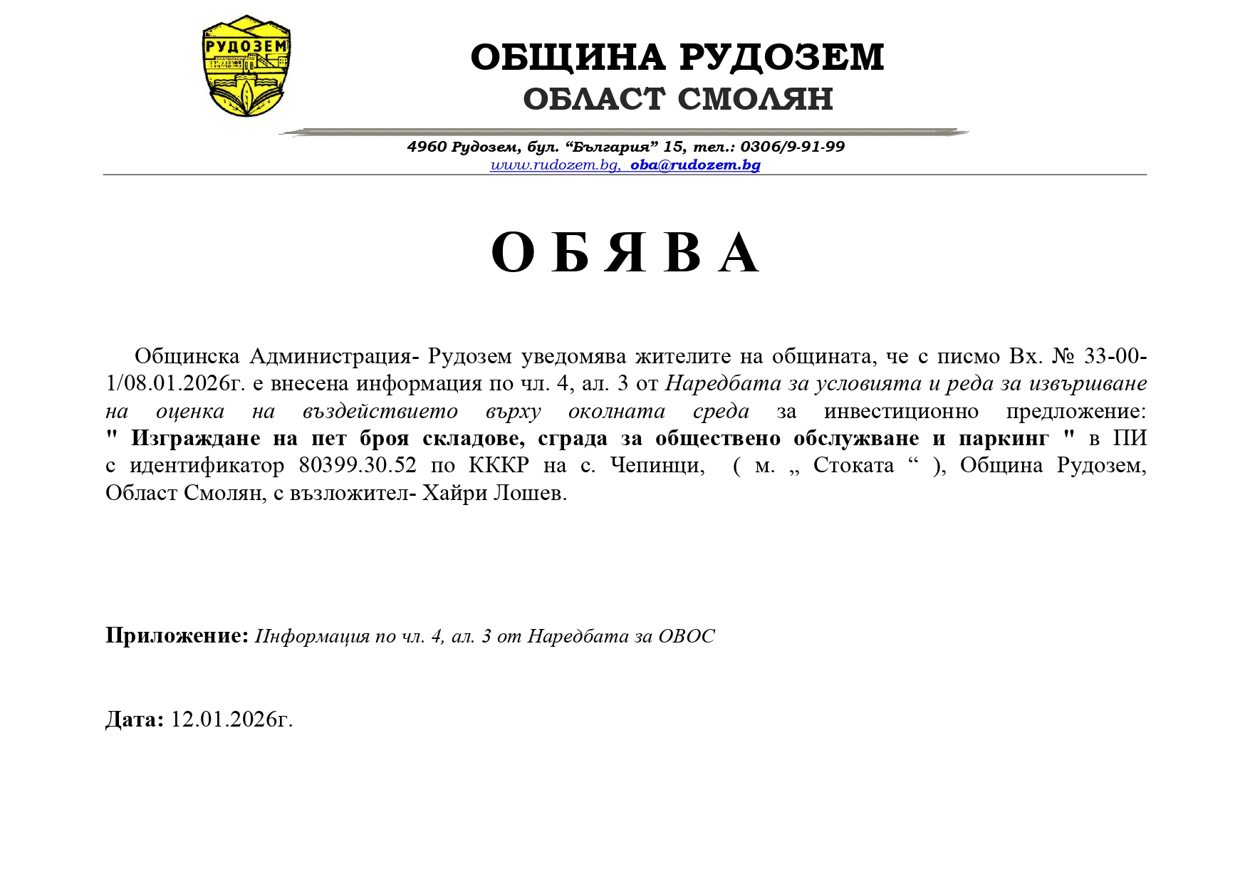 Обява за инвестиционно предложение в землището на с. Чепинци