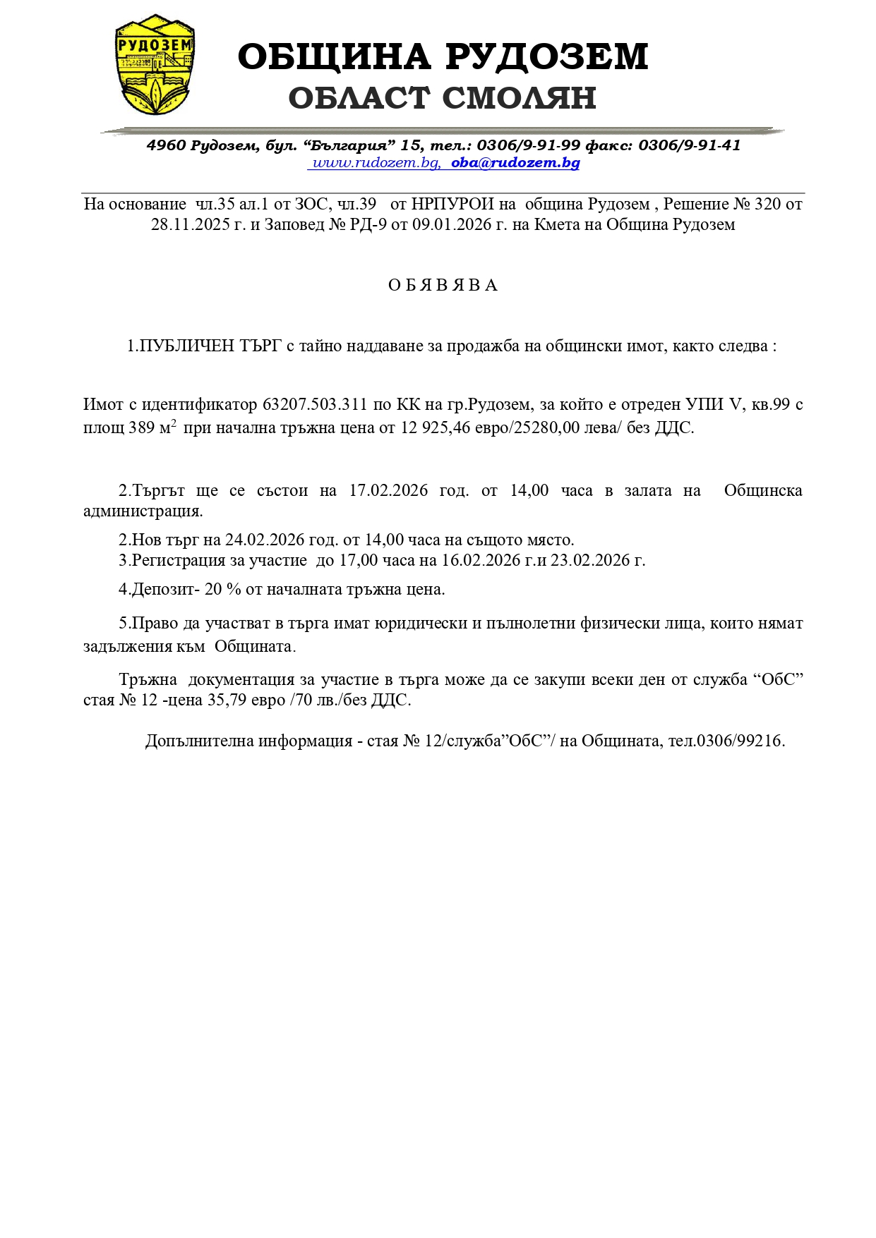 ПУБЛИЧЕН ТЪРГ с тайно наддаване за продажба на общински имот