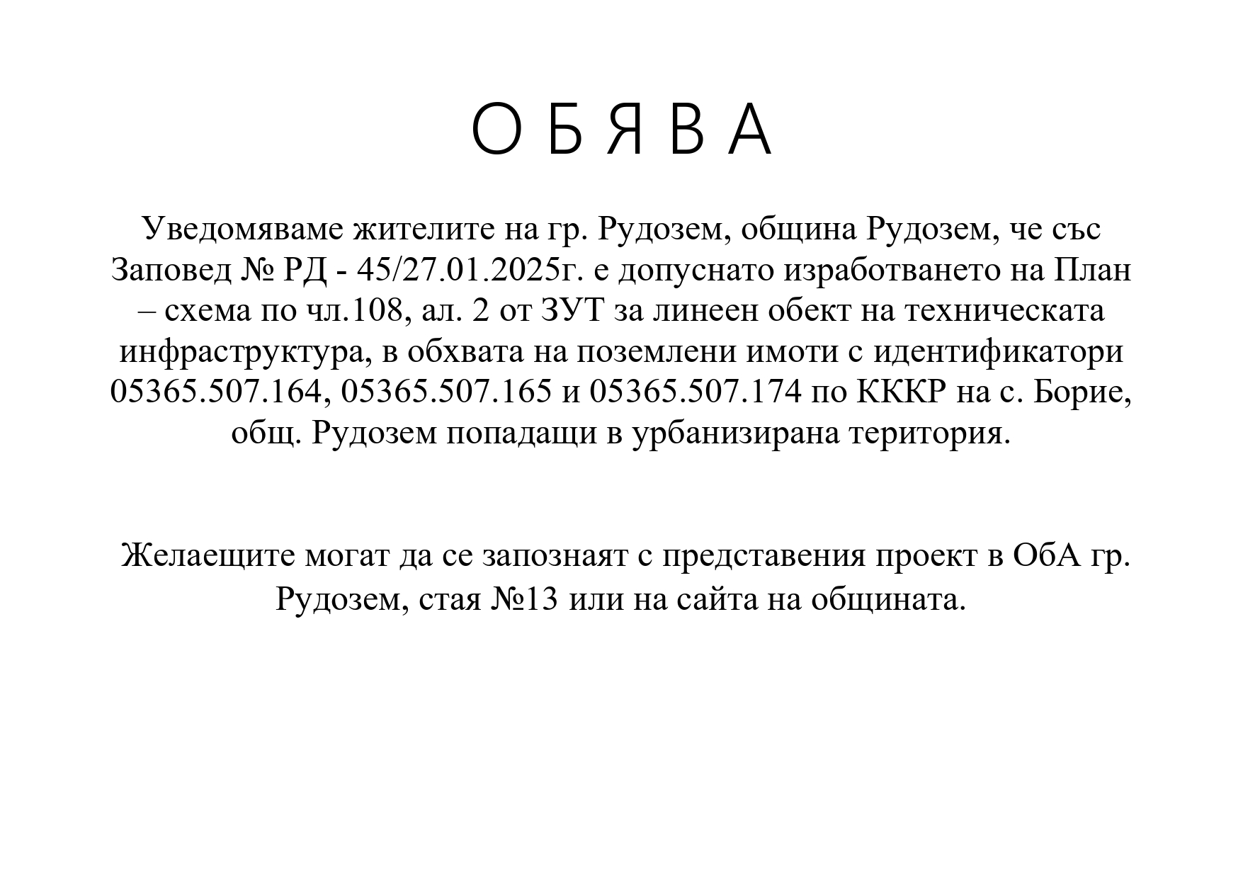 Обява и Заповед № РД - 45 от 27.01.2025 г.