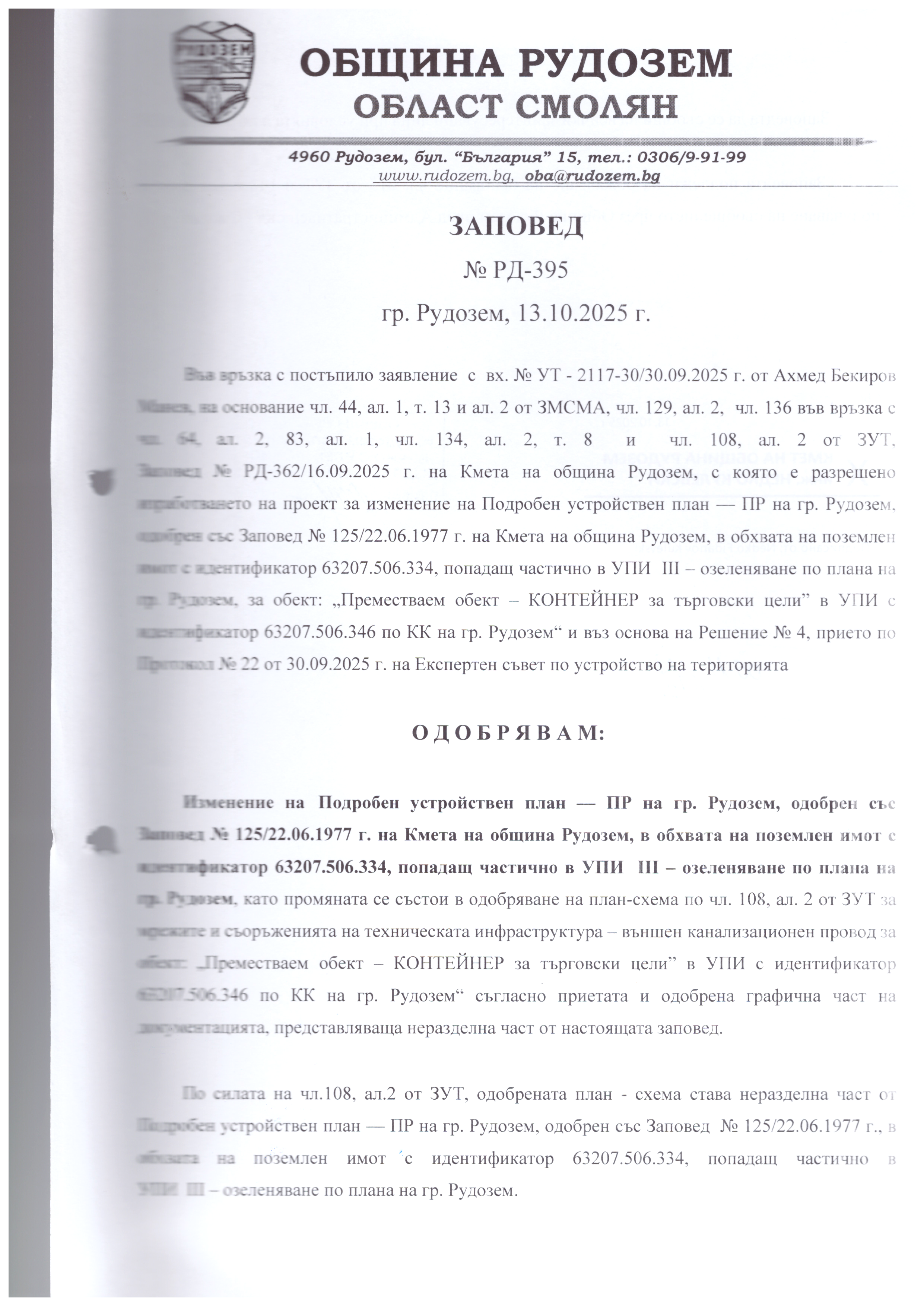 Докл.: Кмет на Община Рудозем