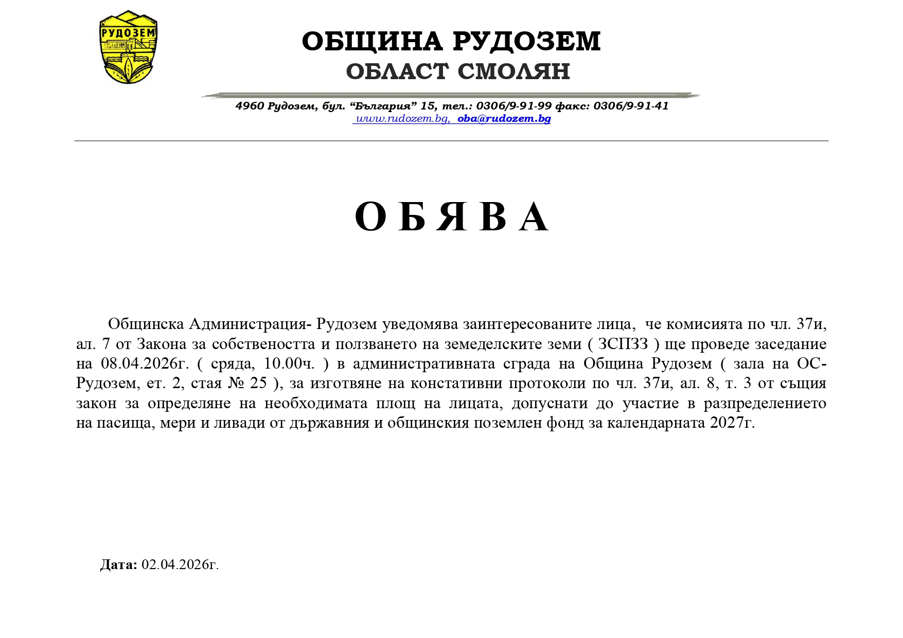 Обява за заседание на комисия по чл. 37и от ЗСПЗЗ