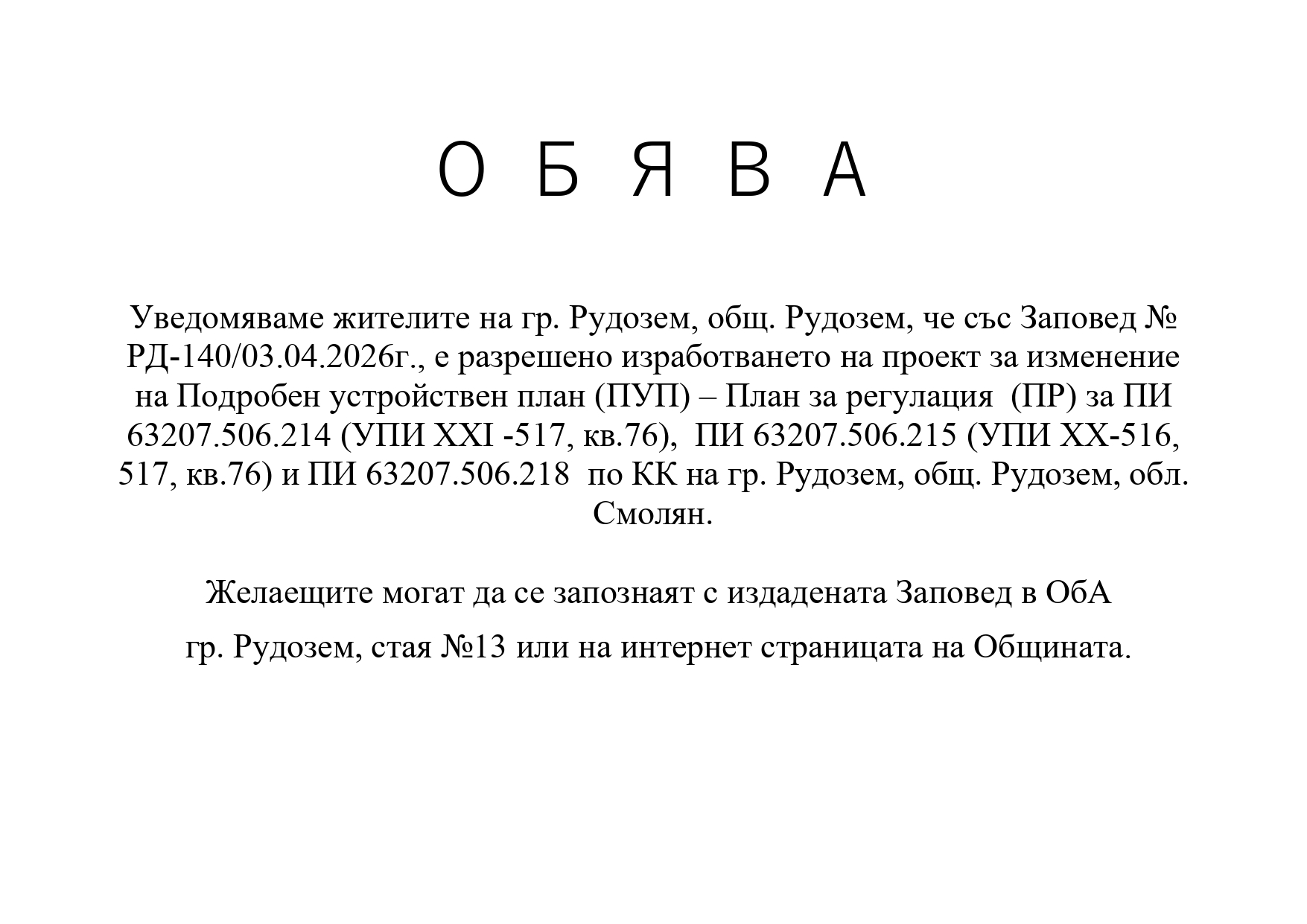 Обява и Заповед № РД-140 от 03.04.2026г.