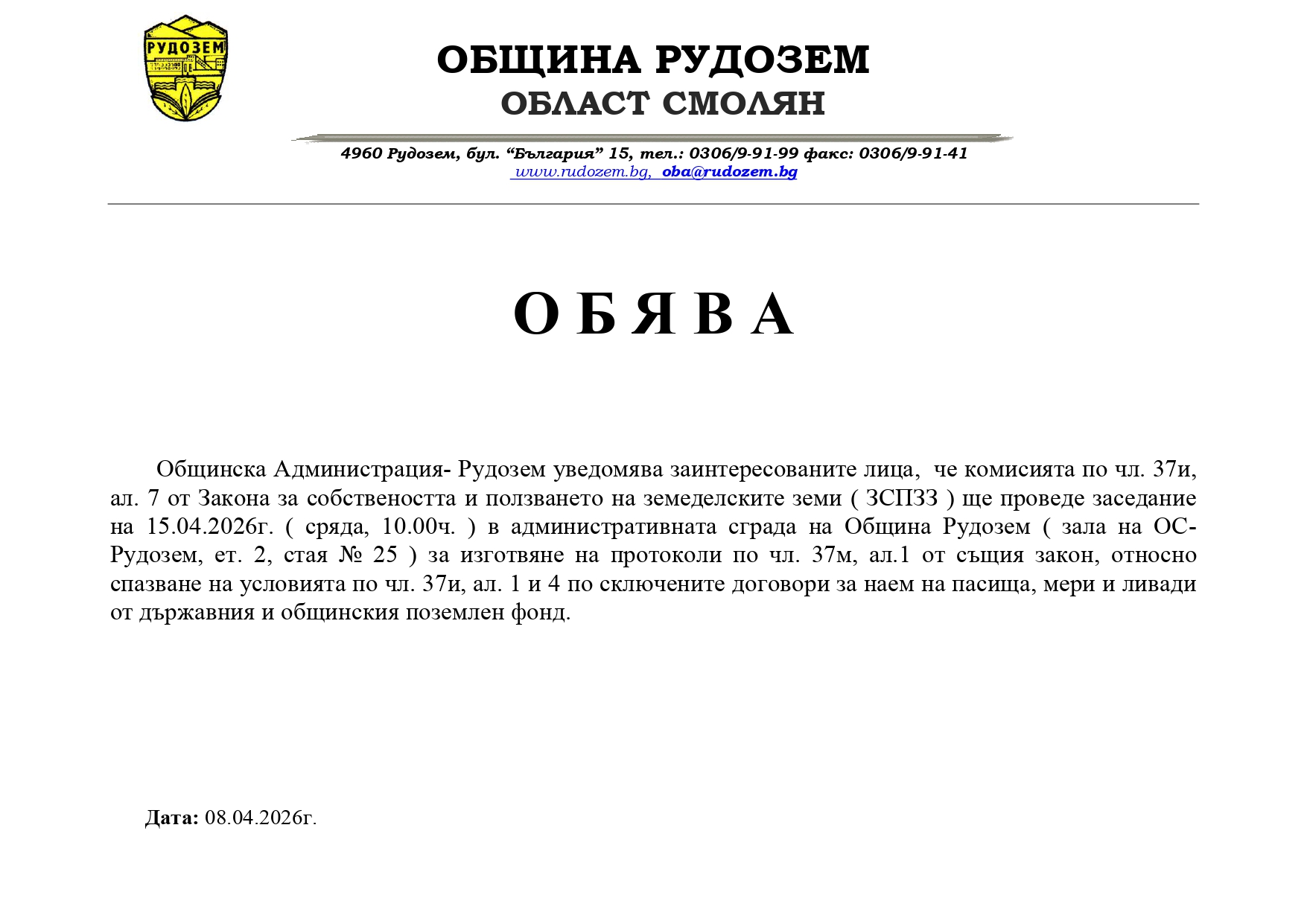 Обява за заседание на комисия по чл. 37и, ал. 7 от ЗСПЗЗ