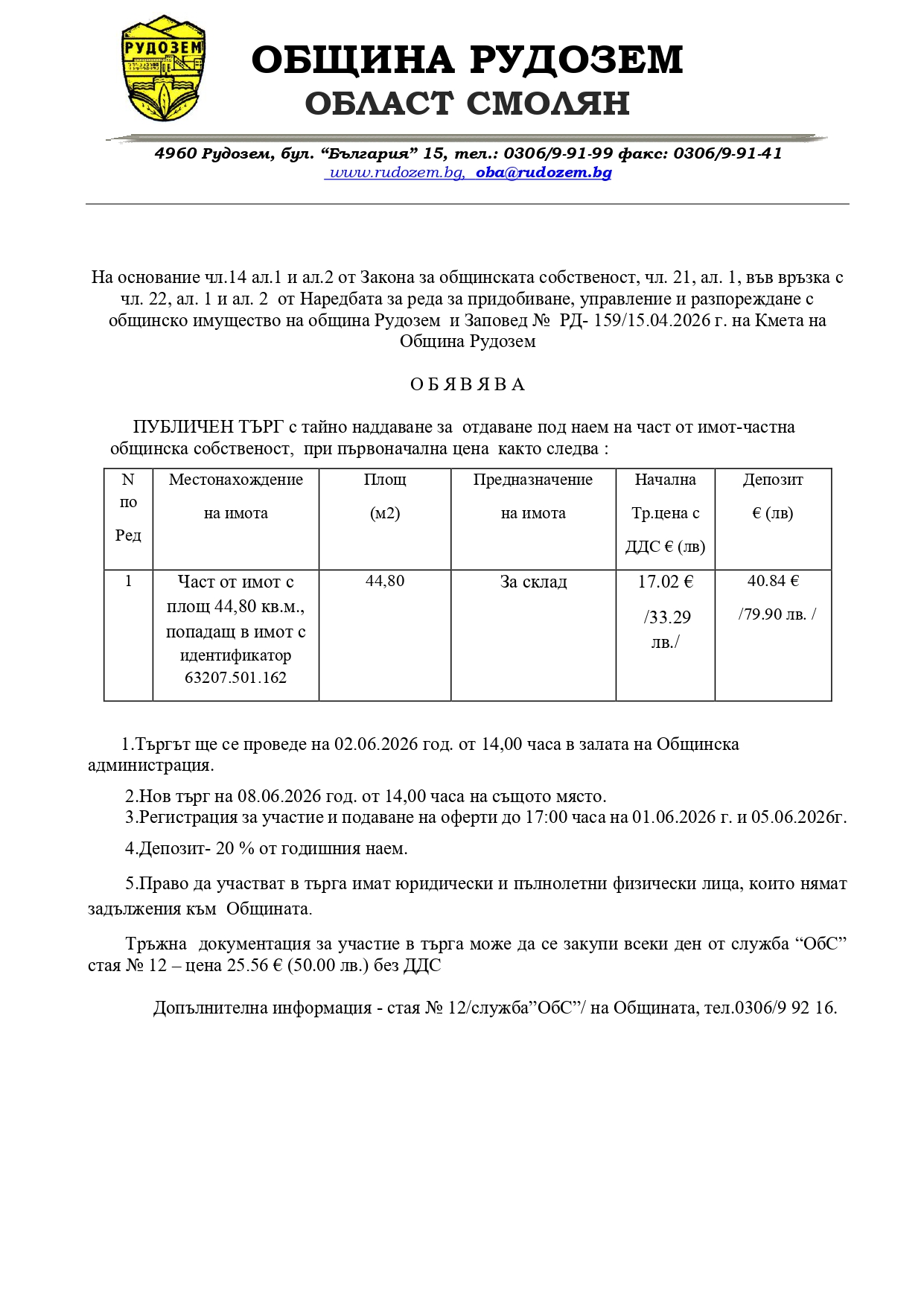 ПУБЛИЧЕН ТЪРГ с тайно наддаване за отдаване под наем на част от имот-частна общинска собственост