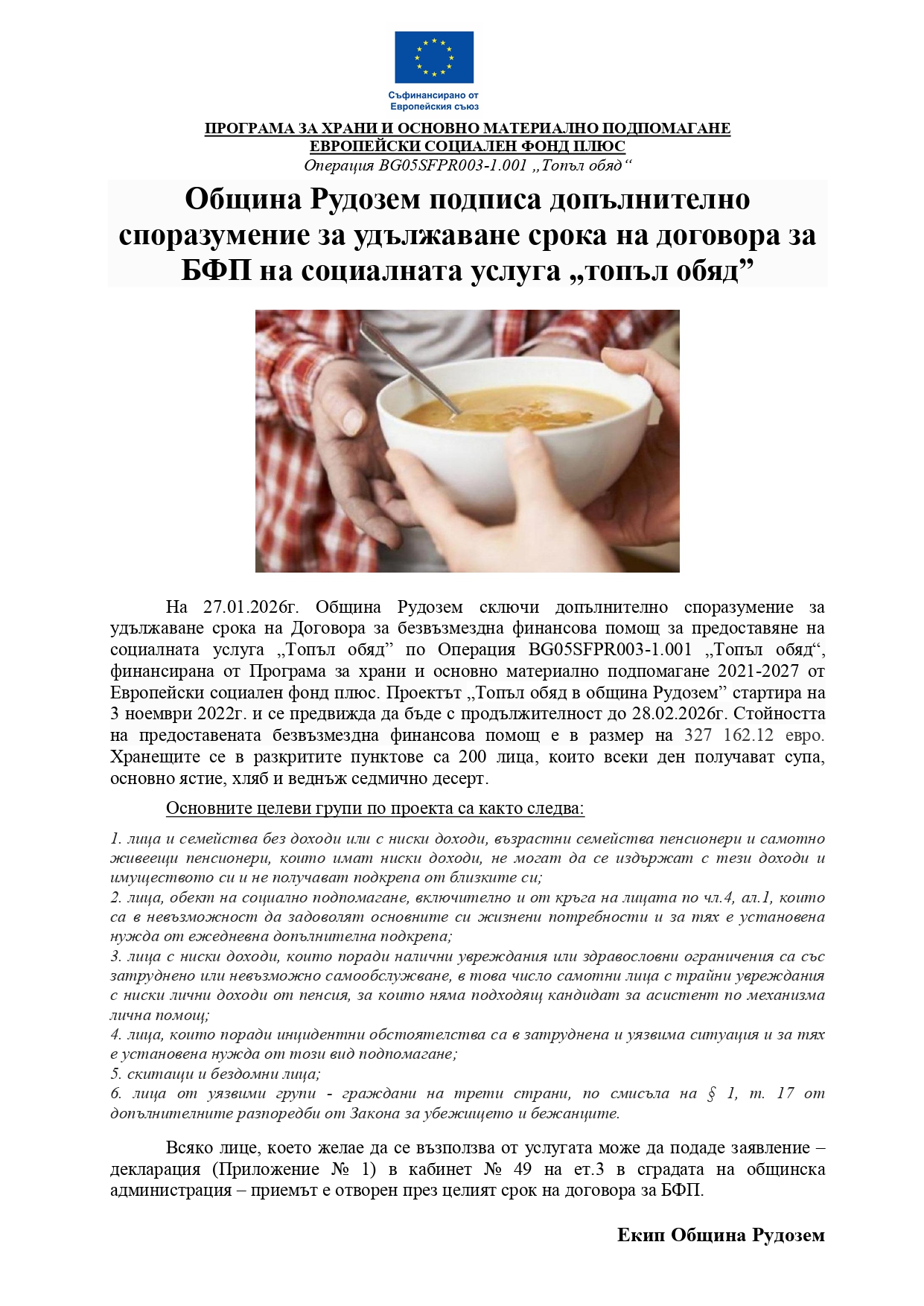 Община Рудозем подписа допълнително споразумение за удължаване срока на договора за БФП на социалната услуга „топъл обяд”