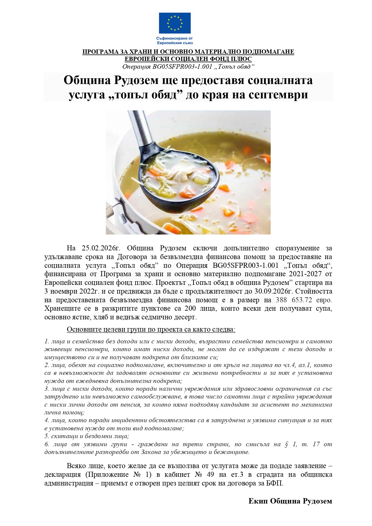 В края на 2025 година Община Рудозем е с пълен капацитет на социалната услуга „топъл обяд”