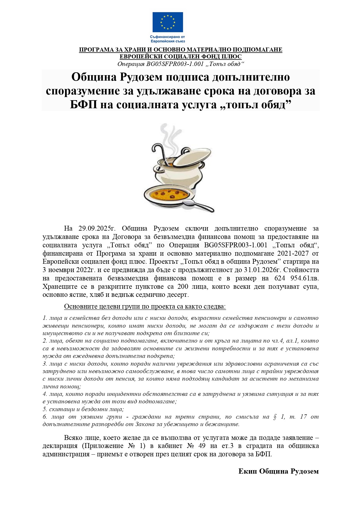 Община Рудозем подписа допълнително споразумение за удължаване срока на договора за БФП на социалната услуга „топъл обяд”