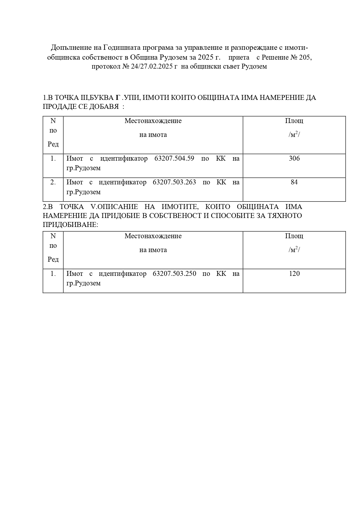 Допълнение на Годишната програма за управление и разпореждане с имоти-общинска собственост в Община Рудозем за 2025 г. приета с Решение № 205, протокол № 24/27.02.2025 г на общински съвет Рудозем