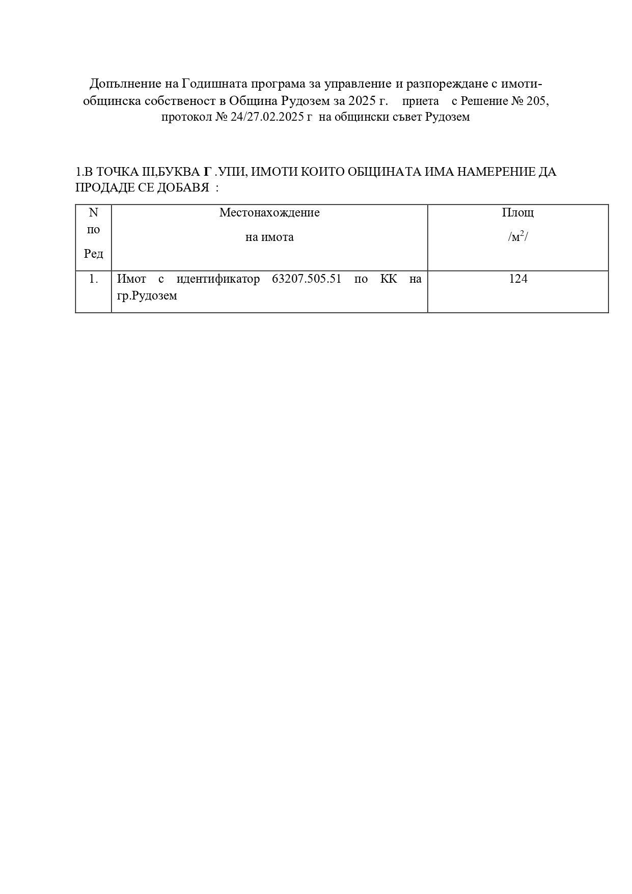 Допълнение на Годишната програма за управление и разпореждане с имоти-общинска собственост в Община Рудозем за 2025 г. приета с Решение № 205, протокол № 24/27.02.2025 г на общински съвет Рудозем