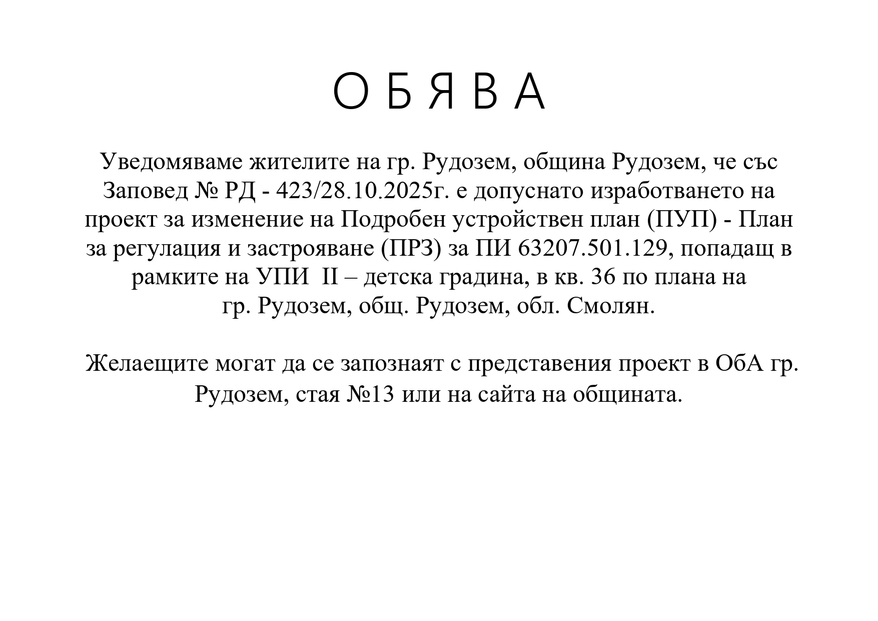Обява и Заповед № РД - 423 от 28.10.2025г.