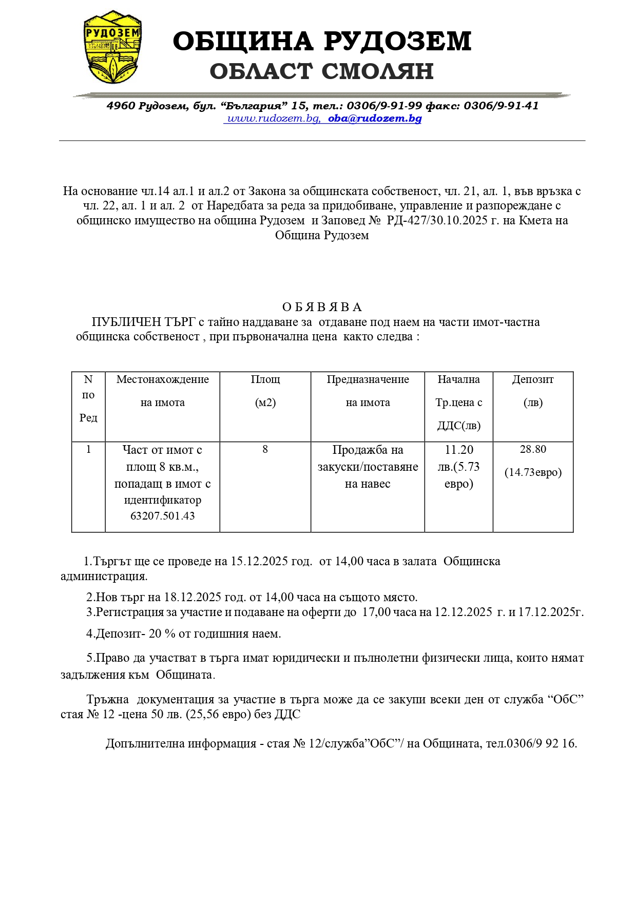 ПУБЛИЧЕН ТЪРГ с тайно наддаване за отдаване под наем на части имот-частна общинска собственост