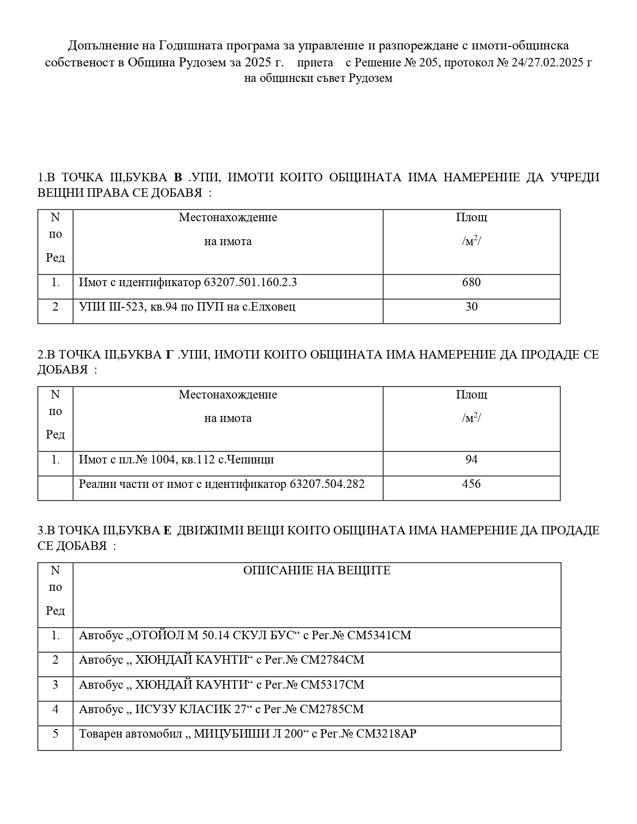 Допълнение на Годишната програма за управление и разпореждане с имоти-общинска собственост в Община Рудозем за 2025 г. приета с Решение № 205, протокол № 24/27.02.2025 г на общински съвет Рудозем