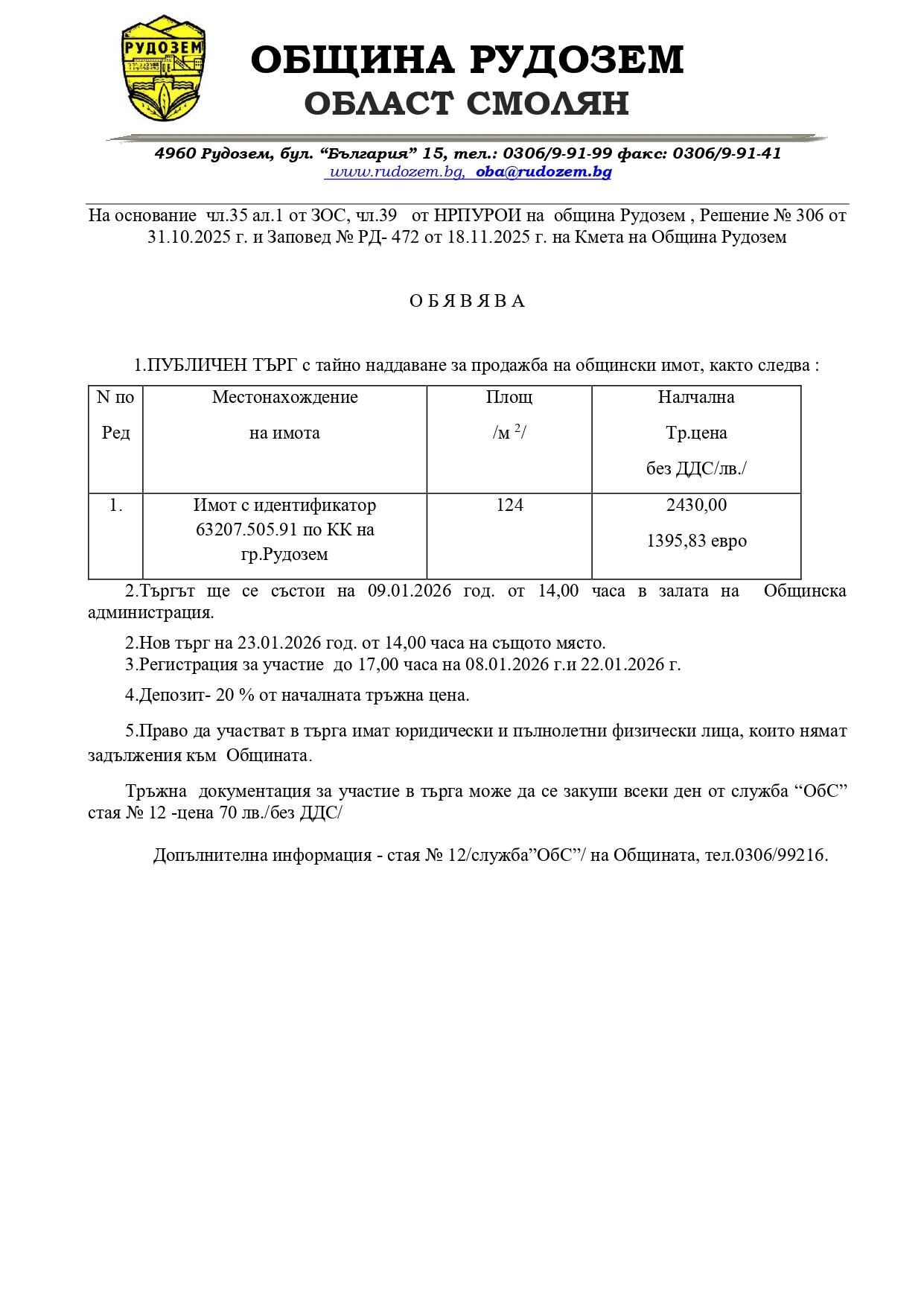 ПУБЛИЧЕН ТЪРГ с тайно наддаване за продажба на общински имот