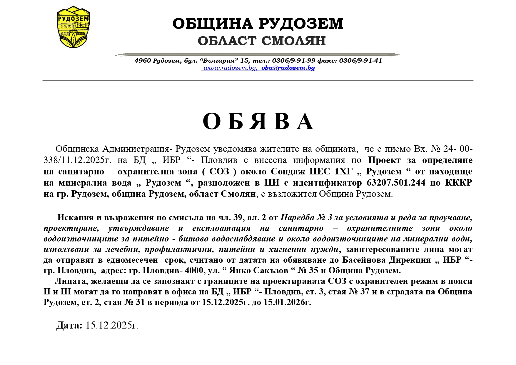 Обявление във връзка с проект за определяне на санитарно-охранителна зона (СОЗ) на Сондаж ПЕС-1ХГ „Рудозем“