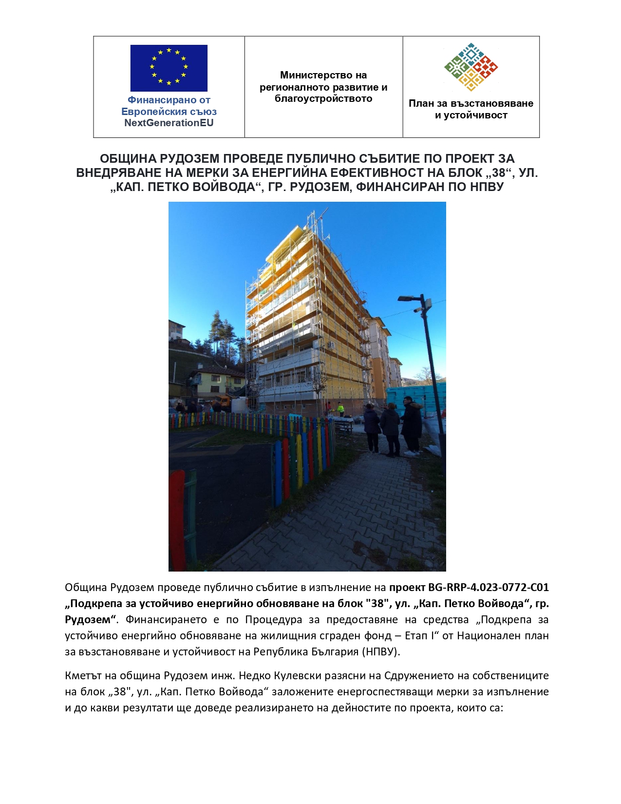 ОБЩИНА РУДОЗЕМ ПРОВЕДЕ ПУБЛИЧНО СЪБИТИЕ ПО ПРОЕКТ ЗА ВНЕДРЯВАНЕ НА МЕРКИ ЗА ЕНЕРГИЙНА ЕФЕКТИВНОСТ НА БЛОК „38“, УЛ. „КАП. ПЕТКО ВОЙВОДА“, ГР. РУДОЗЕМ, ФИНАНСИРАН ПО НПВУ