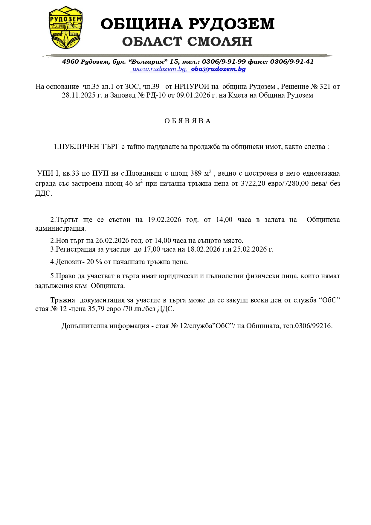 ПУБЛИЧЕН ТЪРГ с тайно наддаване за продажба на общински имот