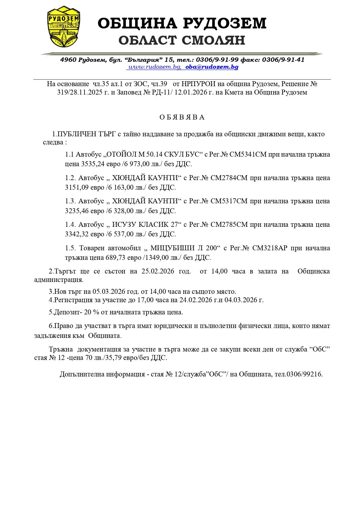 ПУБЛИЧЕН ТЪРГ с тайно наддаване за продажба на общински движими вещи