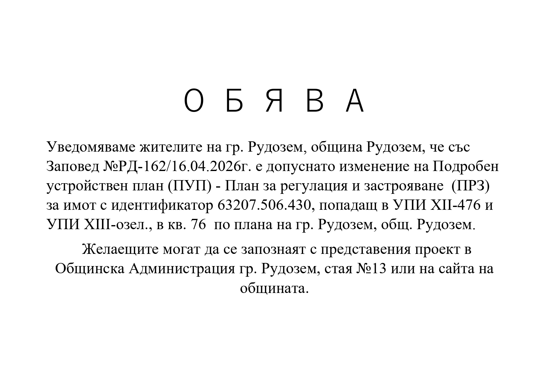 Обява и Заповед № РД-162 от 16.04.2026г.