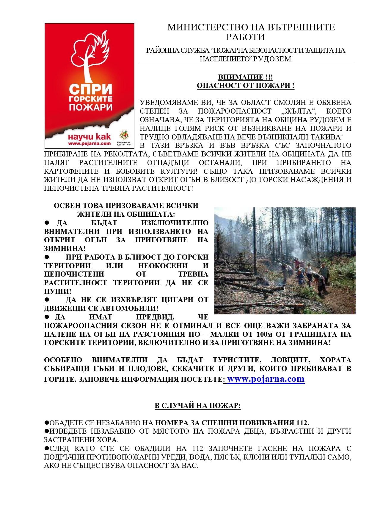 РСПБЗН РУДОЗЕМ ПРЕДУПРЕЖДАВА: ВНИМАНИЕ !!! ОПАСНОСТ ОТ ПОЖАРИ!