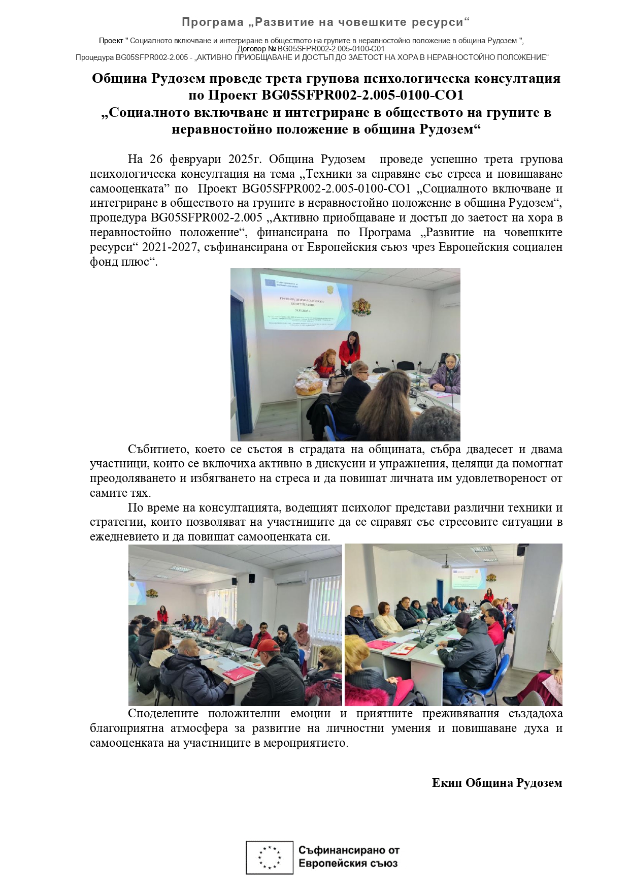 Община Рудозем проведе трета групова психологическа консултация по Проект BG05SFPR002-2.005-0100-СО1 „Социалното включване и интегриране в обществото на групите в неравностойно положение в община Рудозем“